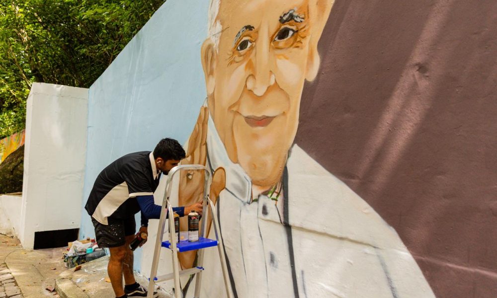 O artista Fred Farias, que também é estudante de Serviço Social, encontrou na cultura Hip Hop a sua voz. Em sua obra, ele não apenas pinta, mas carrega consigo a luta pelos direitos humanos e a força das tradições capixabas. Nascido em um ambiente de manifestações culturais e religiosas, como a romaria dos conguistas, Fred traduz sua memória afetiva em arte. Em seu mural, a fé se apresenta com leveza, quase como um sorriso. Ele planeja retratar a imagem do Papa Francisco, que nos deixou em 2025, e incluir a frase inspiradora: “Concede-me a graça de compreender os sorrisos, para que conheça na vida um pouco de alegria”.